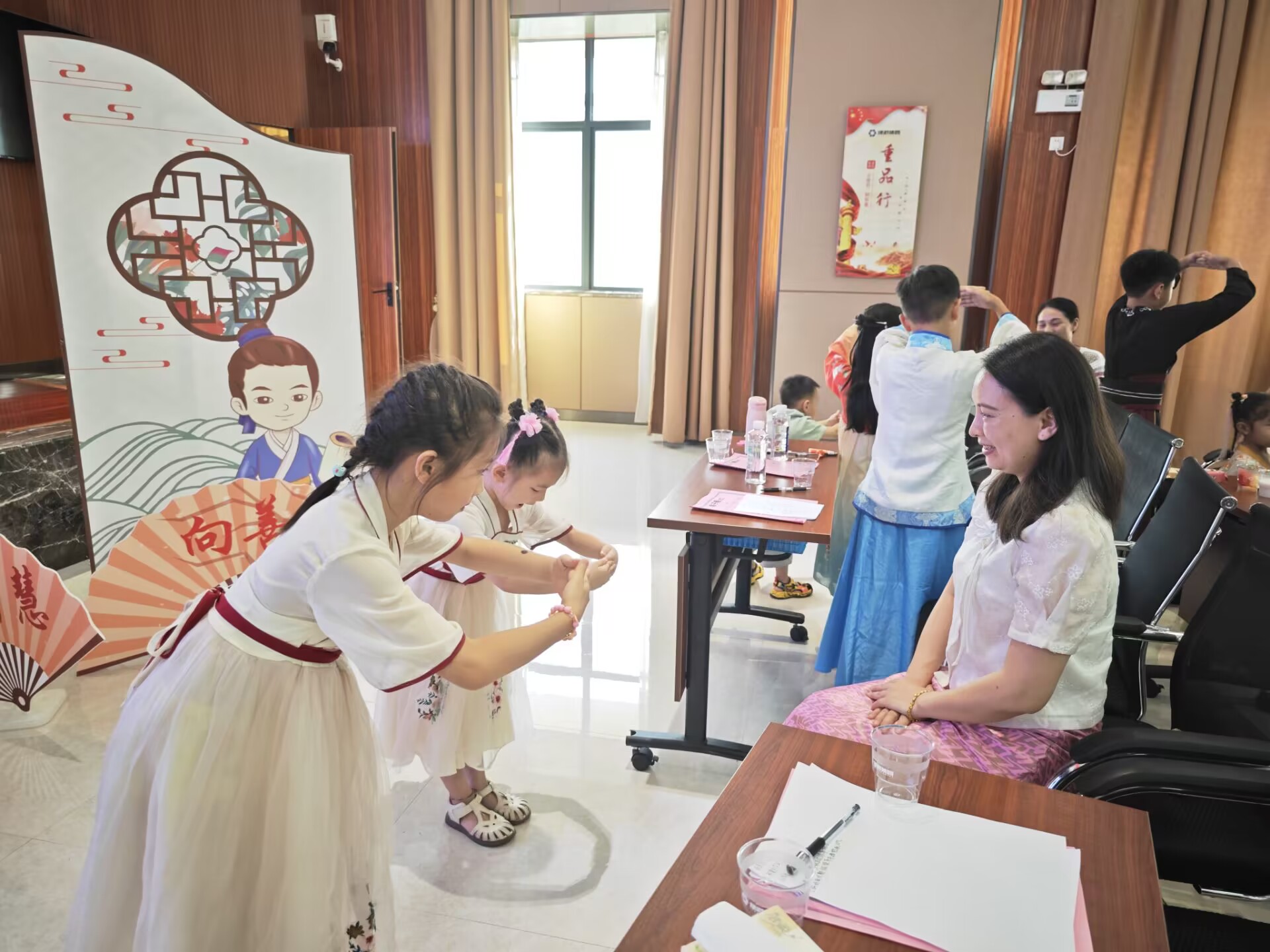 活動以傳統(tǒng)禮儀的學(xué)習和體驗為主題,此次培訓(xùn)邀請了廣西經(jīng)貿(mào)職業(yè)技術(shù)學(xué)院智慧商務(wù)產(chǎn)業(yè)學(xué)院的老師韋斯斯講授少兒禮儀知識。活動中,韋老師向孩子們講解了《弟子規(guī)》中學(xué)習的重要、做人的道理以及待人接物的禮貌常識,讓大家更好地理解傳統(tǒng)的禮儀。韋老師親身示范,教授大家如何正確行認知禮儀、家庭禮儀、餐桌禮儀、待客禮儀、交往禮儀、入泮禮、作揖禮、孝道禮儀等,在抬手躬身中感受禮儀之邦的古韻,學(xué)習尊師重教的品德。韋老師結(jié)合理論知識學(xué)習,邀請孩子們上臺實操演練,模擬情景表演、開展親子互動小游戲等,孩子們紛紛上臺,為大家展示,將學(xué)到的文明禮儀知識落實到行動中,培訓(xùn)現(xiàn)場生動形象、氣氛熱烈,孩子們?nèi)褙炞⒙犎±蠋煹闹v解,依照老師的示范,認真的學(xué)習禮儀,體驗傳統(tǒng)禮儀。