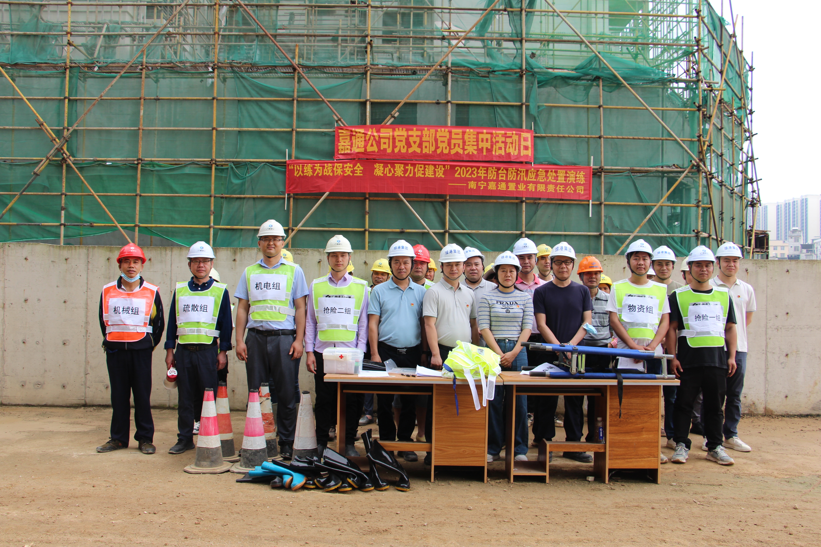為進一步提升項目管理人員應對汛情的應急處置能力,提高員工防臺防汛的安全意識,保障項目現(xiàn)場的設備和人身財產安全,4月19日,嘉通公司聯(lián)合施工單位廣西建工第一建筑工程集團有限公司在綠港·尚尊一品項目現(xiàn)場開展“以練為戰(zhàn)保安全 凝心聚力促建設”2023年防臺防汛應急處置演練,全面筑牢安全生產防線。綠港集團安全監(jiān)督部、項目負責人、業(yè)主代表及一線施工人員約30人參加本次活動。集團黨委委員、副總經理黃麗琴到現(xiàn)場觀摩指導并作防臺防汛工作部署。嘉通公司黨支部書記、總經理何小勇在演練前致辭。