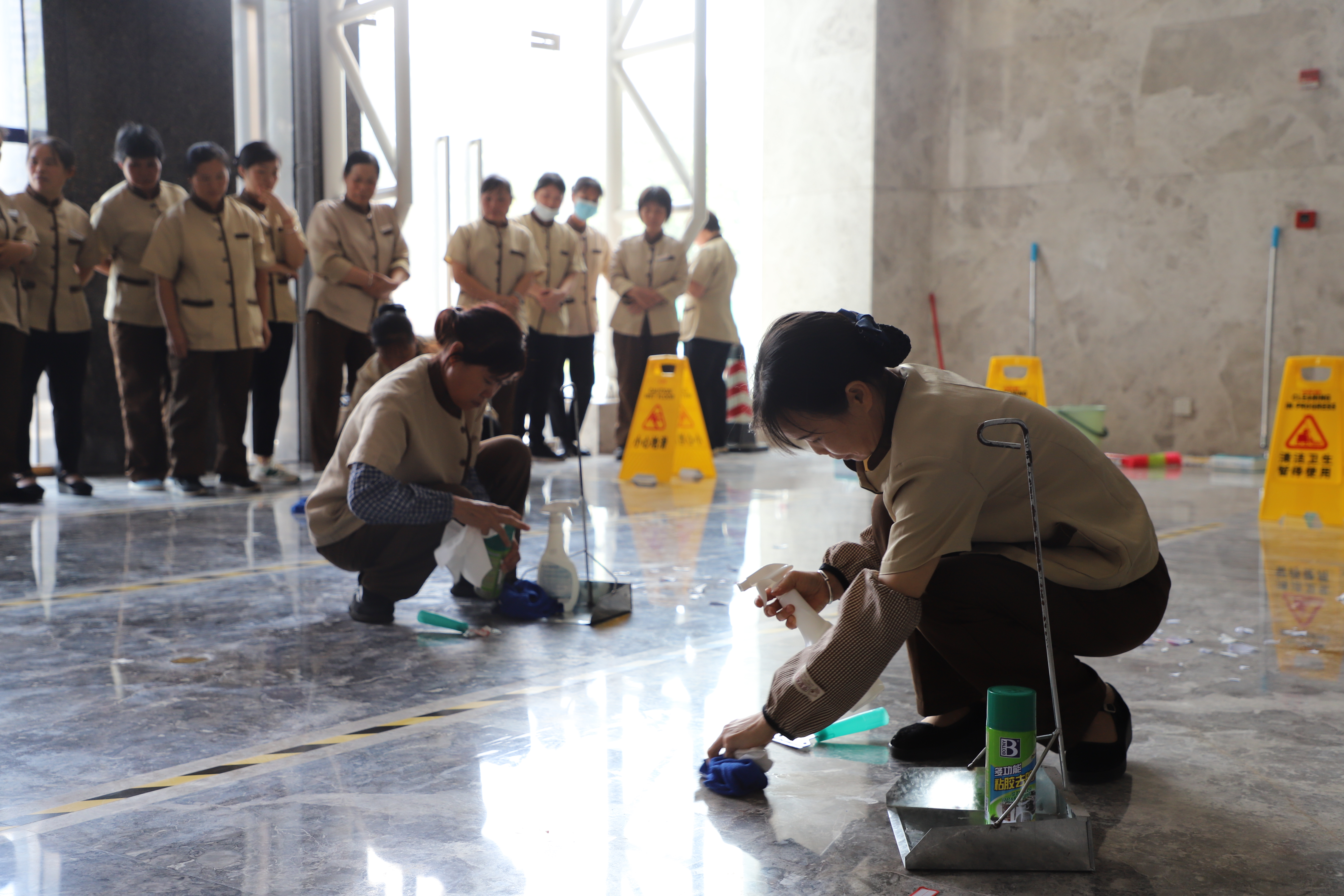 在她們的一雙巧手下地板煥然一新,充分展現(xiàn)了萬(wàn)方保潔人員的專業(yè)風(fēng)采。