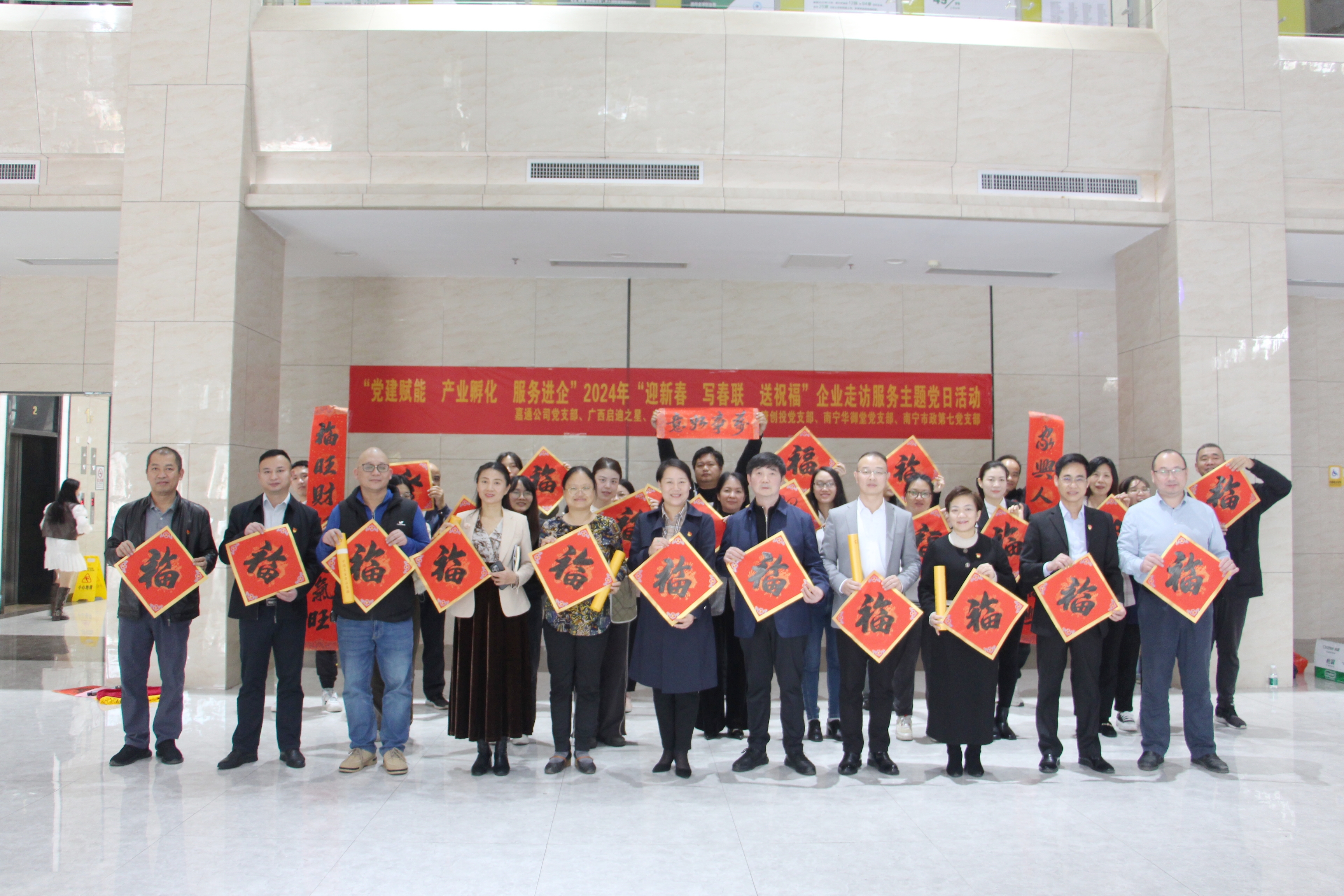 為深化黨建與業(yè)務(wù)融合,通過(guò)黨建引領(lǐng)提升企業(yè)服務(wù)質(zhì)量,發(fā)揮好產(chǎn)業(yè)經(jīng)濟(jì)穩(wěn)定器功能,以做強(qiáng)“鏈上黨建”推動(dòng)產(chǎn)業(yè)高質(zhì)量發(fā)展,1月19日,嘉通公司黨支部深入金凱工業(yè)園聯(lián)合廣西啟迪之星公司、廣西器檢中心黨支部、北部灣創(chuàng)投黨支部、南寧華御堂黨支部、南寧市政第七黨支部開(kāi)展“黨建賦能 產(chǎn)業(yè)孵化 服務(wù)進(jìn)企”2024年“迎新春 寫(xiě)春聯(lián) 送祝?!逼髽I(yè)走訪服務(wù)主題黨日活動(dòng),嘉通公司黨支部黨員代表及職工代表參加本次活動(dòng)。
